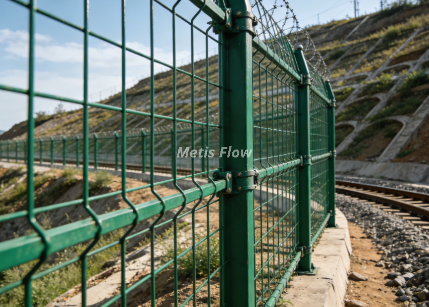 Our railway fencing is made of high-quality low-carbon steel wire (diameter 3.2-4.0mm) and thickened square steel posts, adopts full-automatic high-frequency welding technology, each welding point is firm and seamless, no loosening under vibration. The whole product undergoes hot-dip galvanizing + electrostatic powder coating double anti-corrosion treatment, galvanizing layer thickness ≥85μm, powder coating layer ≥65μm, can resist acid, alkali, salt spray and dust erosion, service life up to 20+ years. It adopts 50*100mm anti-climb mesh design, no climbing points, and the bottom is closed to prevent small animals from entering tracks, avoiding railway operation accidents. Installation uses expansion bolts and embedded fixation, firm and anti-shake, height customizable from 1.8-3.0m, widely applied to ordinary railway perimeter overall security protection